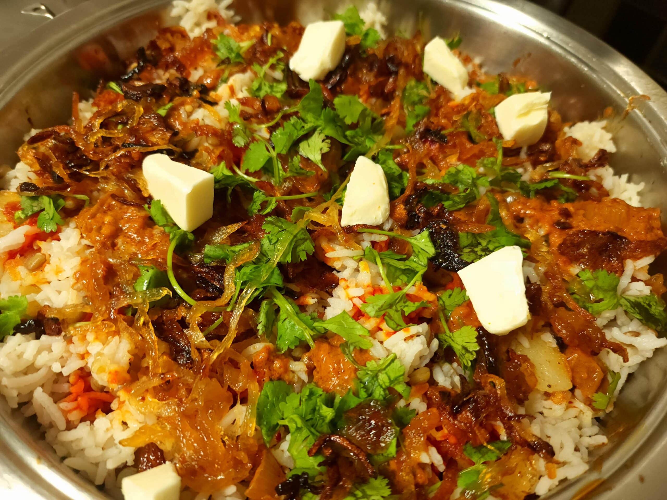 When the chicken is almost cooked it is showtime. Dish the chicken out if you are using another dish to steam your breyani, or if you are using the same pot then you can start layering the rice directly over the chicken. You then layer the potatoes, some mint leaves, dhania leaves and top it off with the crispy onions that you set aside earlier. Top with a few pieces of ghee or butter.